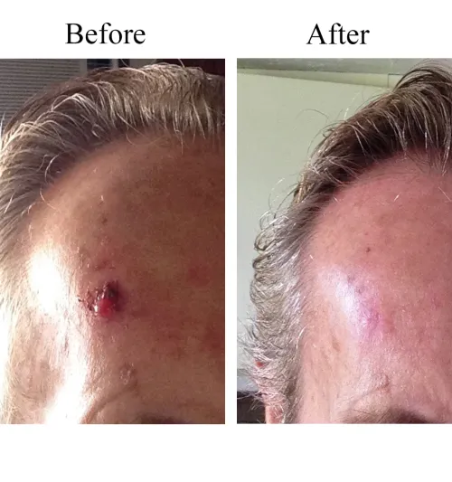 I tried your ointment and my lesion significantly cleared up in 1 week. It may not have been a cancer but untreated it could have converted to a BCC of which I have a history). I have included before and after pictures. The lesion has cleared up even further after taking the second picture. I will keep you informed about the lesion. The focus on the photos is not the best. Visually the lesion has almost disappeared.